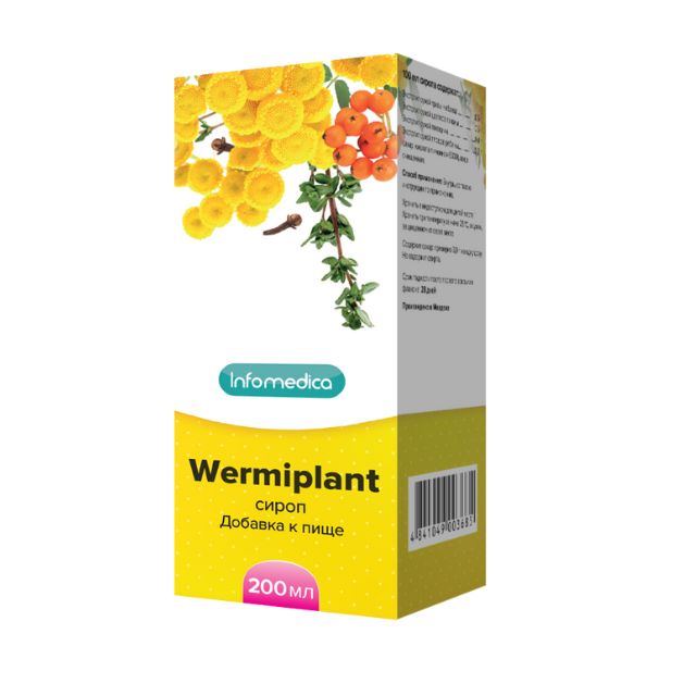 Indicații:- Invazii intestinale provocate de următorii paraziți: Giardia lamblia, Ascaris lumbricoides, Enterobius vermicularis, etc. WERMIPLANT, sirop nu provoacă dependență, în plus, are un efect hepatoprotector, protejând ficatul de efectele nocive ale medicamentelor și toxinelor. VALOAREA ENERGETICĂ ȘI NUTRITIVĂ 273,9 kcal/flacon. O doză de 5 ml conține 13,7 kcal
